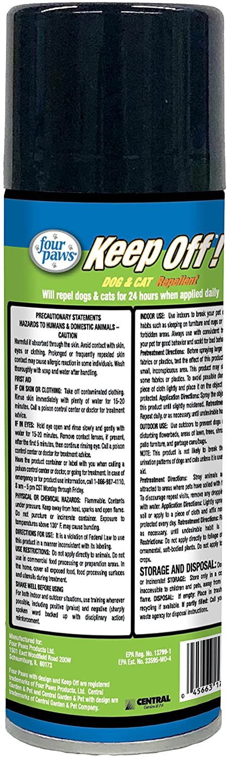 Four Paws Keep Off! Indoor and Outdoor Repellent for Dogs and Cats. Just spray and they'll stay away from furniture, carpet, trees, shrubs, garbage cans and other forbidden areas. Will repel dogs and cats for up to 24 hours when applied daily.