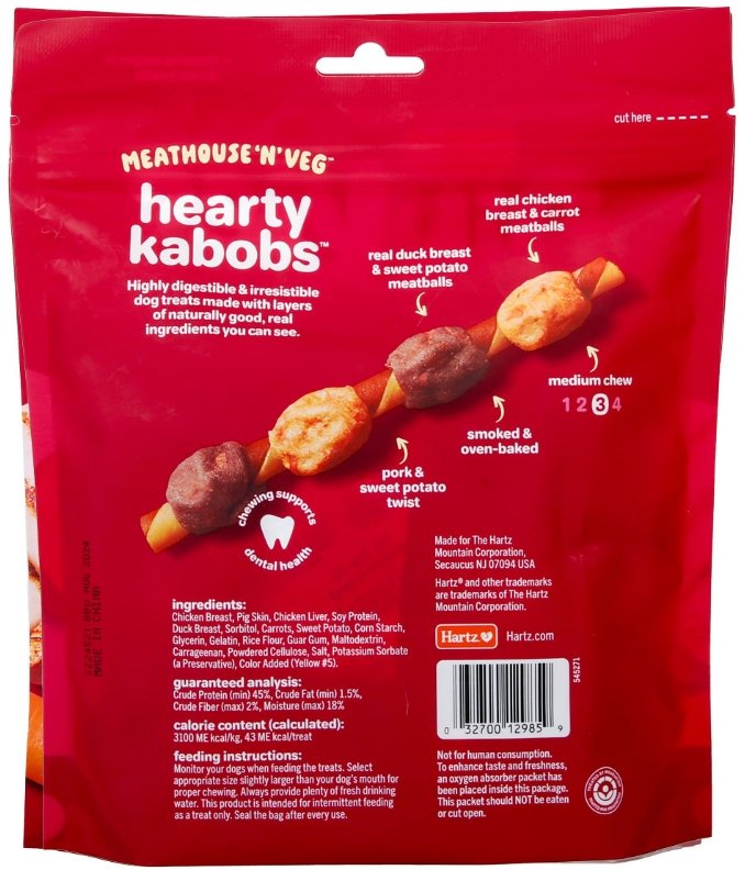 Hartz Oinkies Meathouse 'n' Veg Hearty Kabobs are highly digestible and irresistible dog treats made with layers of naturally good, real ingredients you can see. Does not contain beefhide or beef rawhide, the real pork and sweet potato twist core is loaded with chunks of real chicken breast & carrot meatballs and real duck breast and sweet potato meatballs. These dog treats are smoked and oven-baked to lock in that delicious flavor your dog will go crazy for! Oinkies Hearty Kabobs are considered a medium chew.