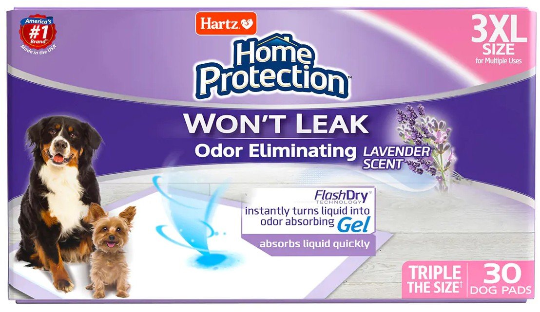Hartz Home Protection Lavender Scent Odor Eliminating 3XL Dog Pads in the ultimate absorbent pads to soak up your dogs messes before they spread. With advanced FlashDry technology, the pad instantly turns urine into a harmless gel that will not leak or spread and the harmonizing odor technology neutralizes odors, not masks them. When it comes to protecting your home, Hartz has you covered.