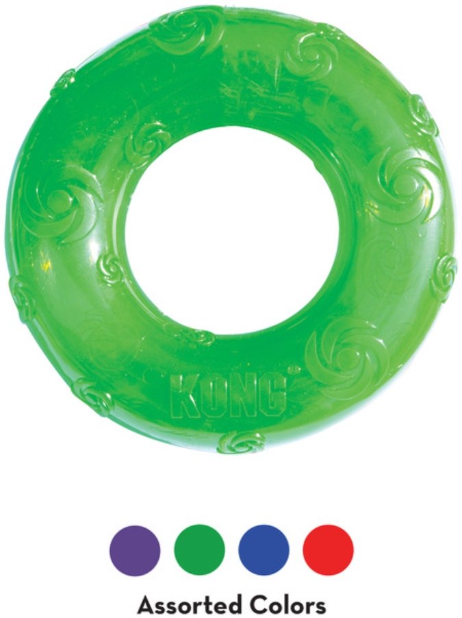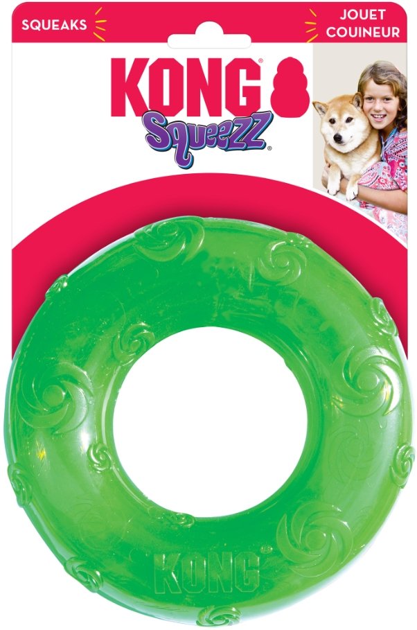 KONG Squeezz Ring Dog Toy provides hours of safe fun for your dog. Whereas most squeaky toys are easy to destroy or puncture, the KONGs Squeezz Ring Dog Toy features a completely safe, durable non-toxic rubber.