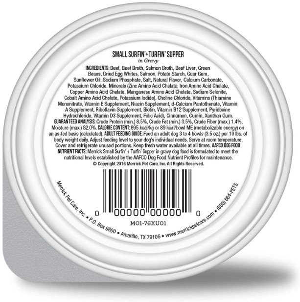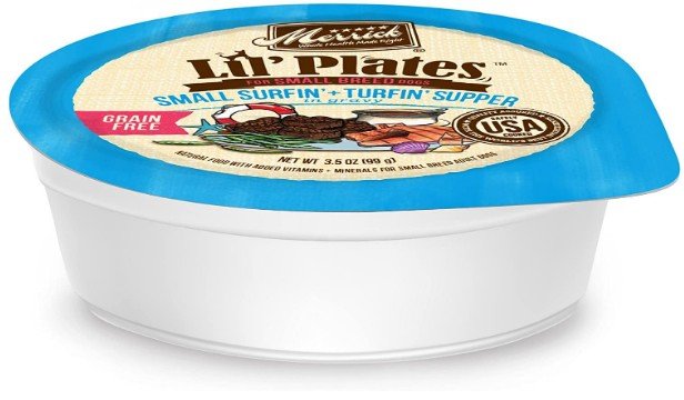 Merrick Lil' Plates Grain Free Small Breed Wet Dog Food Surfin' and Turfin' Supper delivers the delicious taste and the meaty texture your tiny pup will love. Real deboned beef is always the first ingredient in this small breed dog food to help build and maintain healthy muscle tissue and energy levels. Each dog food tray is made without grain or gluten ingredients for easy digestibility. This protein-rich wet dog food is crafted with a savory salmon broth for flavorful gravy your dog will love .