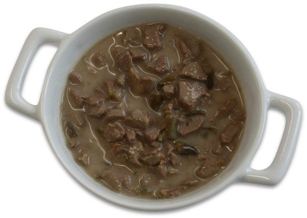 Ingredients: Beef, Beef Broth, Salmon Broth, Beef Liver, Green Beans, Dried Egg Whites, Salmon, Potato Starch, Guar Gum, Sunflower Oil, Sodium Phosphate, Salt, Natural Flavor, Calcium Carbonate, Potassium Chloride, Minerals (Zinc Amino Acid Chelate, Iron Amino Acid Chelate, Copper Amino Acid Chelate, Manganese Amino Acid Chelate, Sodium Selenite, Cobalt Amino Acid Chelate, Potassium Iodide), Choline Chloride, Vitamins (Thiamine Mononitrate, Vitamin E Supplement, Niacin Supplement, D-Calcium Pantothenate, Vitamin A Supplement, Riboflavin Supplement, Biotin, Vitamin B12 Supplement, Pyridoxine Hydrochloride, Vitamin D3 Supplement, Folic Acid), Cinnamon, Cumin, Xanthan Gum.