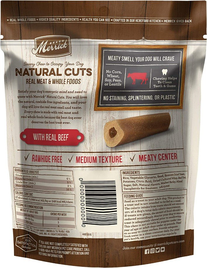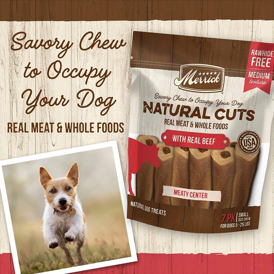 Merrick Natural Cuts are a NEW, rawhide free dog treat designed to occupy your dog with no staining, splintering, or plastic. Made with natural ingredients like real beef and whole foods, these savory dog chews feature a meaty, chewy center your dog will crave.