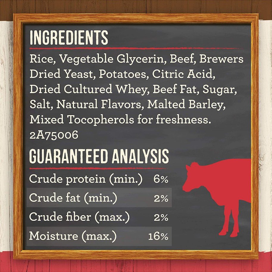 Ingredients: Rice, Vegetable Glycerin, Beef, Brewers Dried Yeast, Potatoes, Citric Acid, Dried Cultured Whey, Beef Fat, Sugar, Salt, Natural Flavors, Malted Barley, Mixed Tocopherols for freshness.