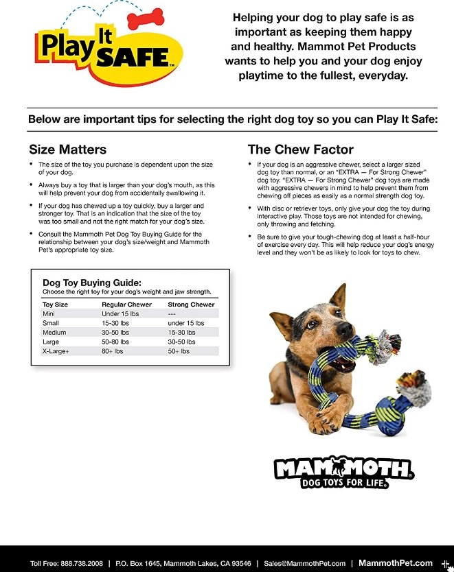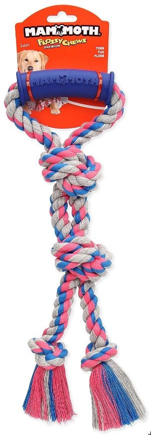 Mammoth Flossy Chews Twin Tug With Rubber Handle Dog Toy are interactive toys that satisfy playing requirements. Rope blend helps dogs maintain good dental hygiene. Tug, toss and floss while playing.