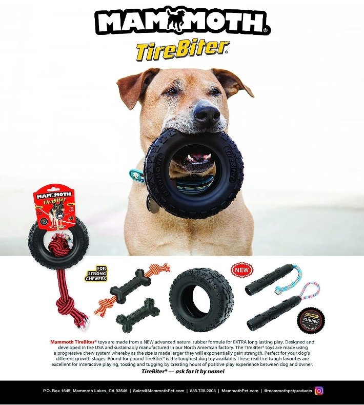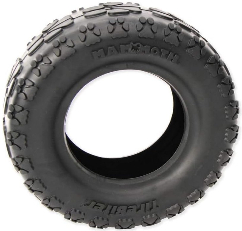 Mammoth TirebiterII toys are made from a NEW advanced natural rubber formula for EXTRA long lasting play. Designed and developed in the USA and sustainably manufactured in our North American factory from USA materials the Tirebiter II toys are made using a progressive chew system whereby as the the size is made larger they will exponentially gain strength. Perfect for your dogs different growth stages. Pound for pound Tirebiter II is the toughest dog toy available. These real-tire-tough favorites are excellent for interactive playing, tossing and tugging by creating hours of positive play experience between dog and owner.