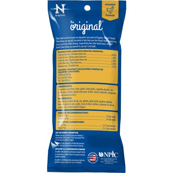 N-Bones The Original Chew Bone for Dogs effectively cleans the upper and lower teeth by removing plaque and tartar buildup. Each all natural treat features a highly palatable chicken flavor, with no added salts or sugars and no artificial preservatives or colors.