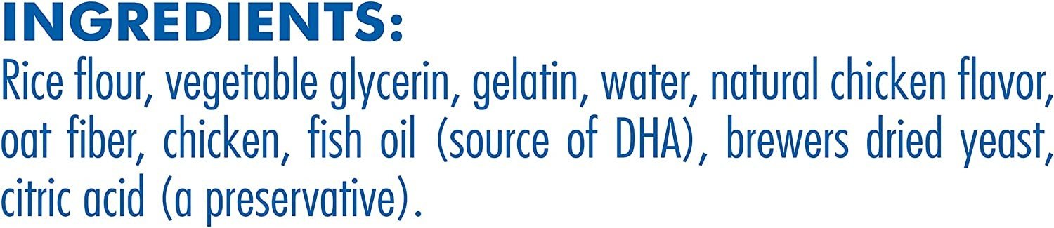 Ingredients: Rice flour, vegetable glycerin, gelatin, water, natural chicken flavor, oat fiber, chicken, fish oil (source of DHA), brewers dried yeast, citric acid (a preservative).