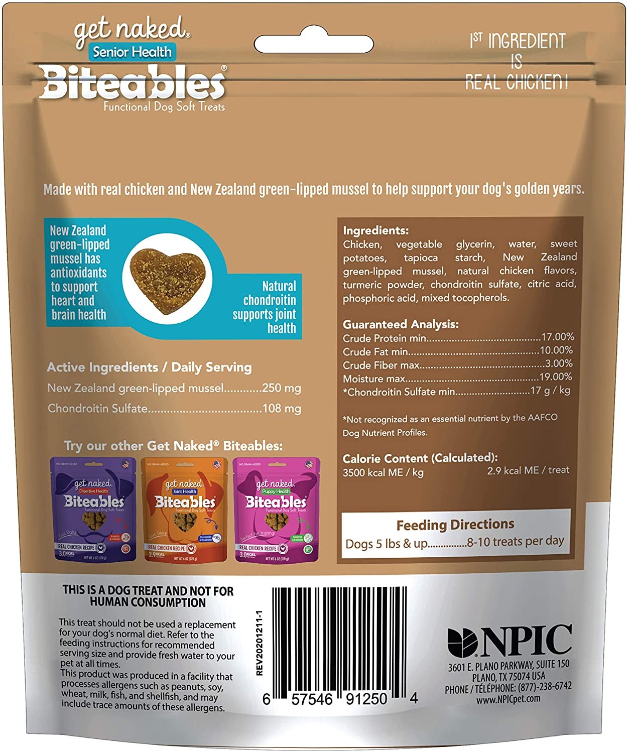 Get Naked Biteables Senior Health Functional Soft Treats are formulated with New Zealand green-lipped mussel that has antioxidants to support heart and brain health, and natural chondroitin to support joint health. Made with real chicken, sweet potatoes, and turmeric, this tiny treat packs a big punch of flavor at just 2.9 calories per treat.