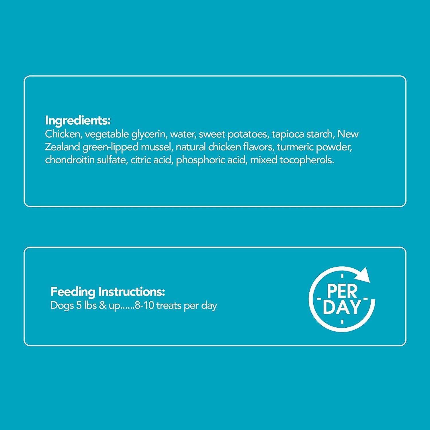 Ingredients: Chicken, vegetable glycerin, water, sweet potatoes, tapioca starch, New Zealand green-lipped mussel, natural chicken flavors, turmeric powder, chondroitin sulfate, citric acid, phosphoric acid, mixed tocopherols.