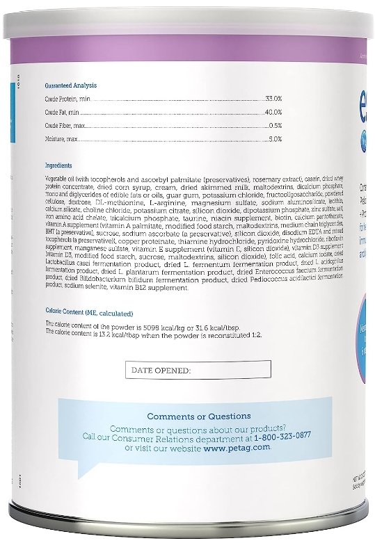 IngredientsVegetable oil, casein, whey protein concentrate, dried skimmed milk, butter fat, monocalcium phosphate, egg yolk, calcium carbonate, L-arginine, DL-methionine, sodium silico aluminate, potassium chloride, choline chloride, lecithin, monopotassium phosphate, magnesium carbonate, ferrous sulfate, salt, dipotassium phosphate, calcium pantothenate, ascorbic acid, niacin supplement, magnesium sulfate, zinc sulfate, folic acid, vitamin E supplement, silicon dioxide, vitamin A supplement, riboflavin, vitamin B12 supplement, thiamine hydrochloride, pyridoxine hydrochloride, manganese sulfate, vitamin D3 supplement, copper sulfate, potassium citrate, potassium iodide, biotin.