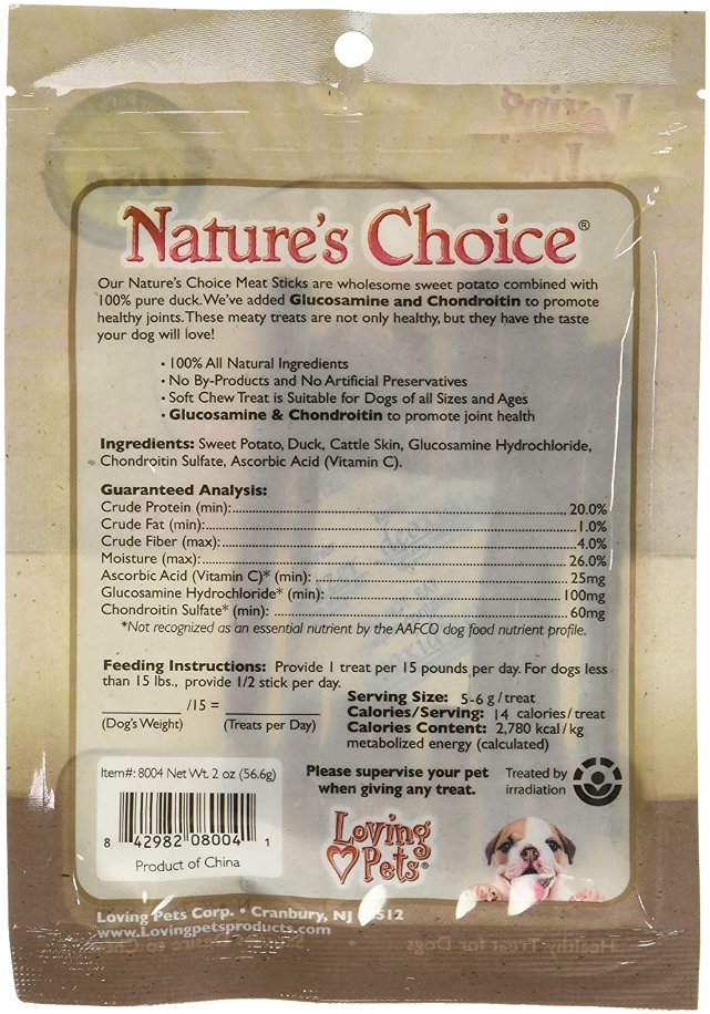 Loving Pets Natures Choice Sweet Potato & Duck Meat Sticks have nothing to hide; unlike other treats that are stuffed with additives and fillers, these tasty treats contain 100% pure meat and tasty sweet potato, with glucosamine, chondroitin and Vitamin C to support healthy joints.