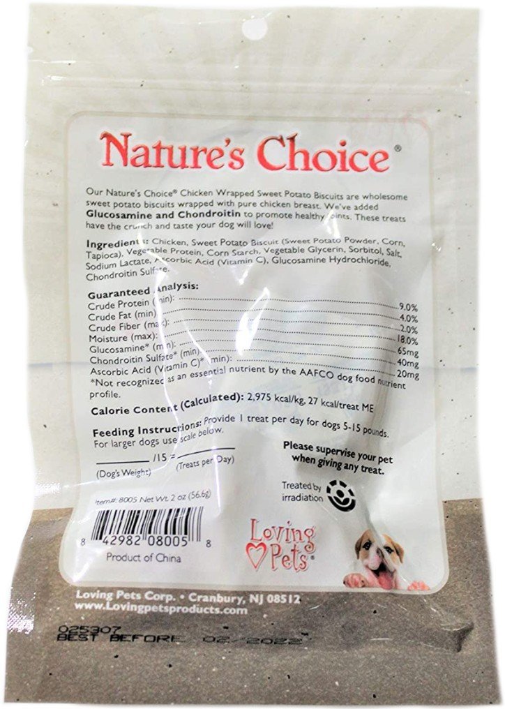 Loving Pets Natures Choice Sweet Potato Biscuits Wrapped with Chicken Breast are the healthiest biscuits your dog will ever munch! Made with wholesome sweet potato flour and real, lean chicken breast, they contain no chemical additives, fillers, by-products, or grains.
