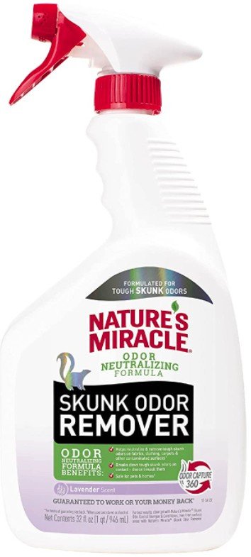 Whether it happens to you, your pet, or your home, few experiences are as daunting as being sprayed by a skunk. Natures Miracle Skunk Odor Remover helps remove skunk odors from fabrics, clothing, carpets, and other contaminated surfaces. Formulated with Odor Capture 360, Natures Miracle Skunk Odor Remover breaks down tough skunk odors on contact and doesn't mask them. The fast-acting formula breaks down the oils sprayed by skunks to help remove odor upon application, leaving a fresh lavender scent behind. Safe to use around pets and homes when used and stored as directed - see product label for use and handling instructions.