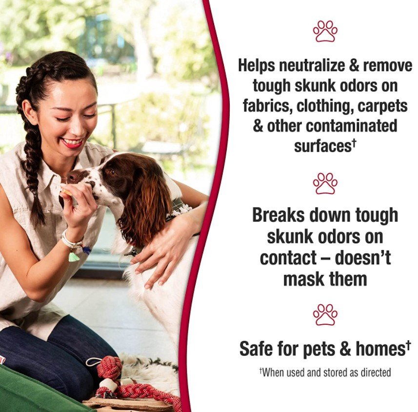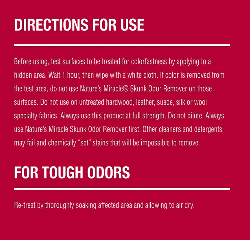 • The fast-acting formula breaks down the oils sprayed by skunks on contact to remove odor when used and stored as directed