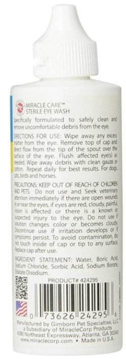 Soothing and gentle, Miracle Care Sterile Eye Wash is specifically formulated to clean and remove uncomfortable eye debris. Safe for dogs and cats, the Sterile Eye Wash is a non-stinging formula that is safe to use in and around the eye.