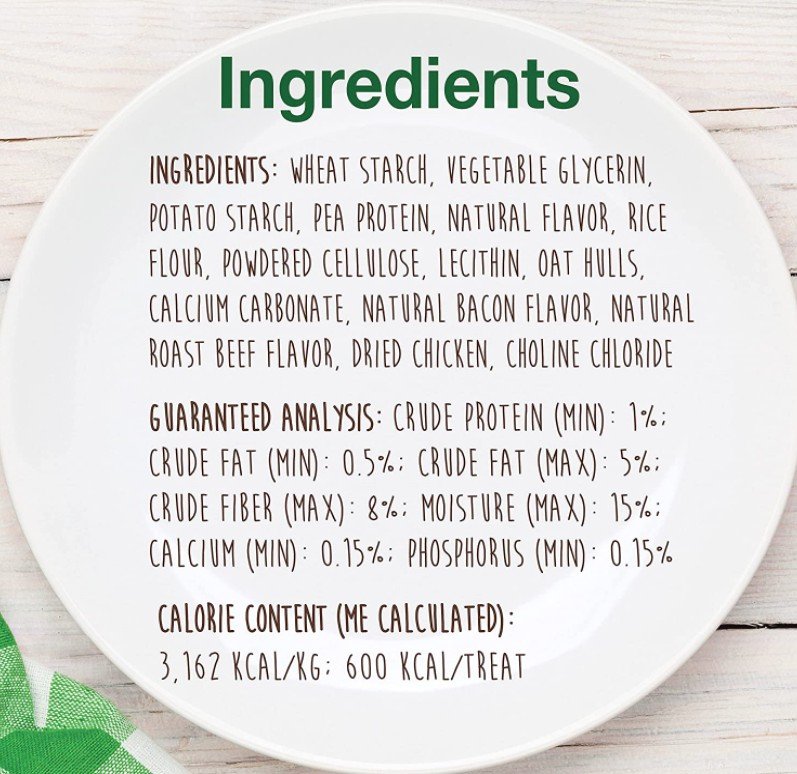 Ingredients: Wheat Starch, Glycerin, Powdered Cellulose, Lecithin, Potato Starch, Chicken Powder, Natural Roast Beef Flavor, Natural Flavor, Oat Fiber, Calcium Carbonate, Soy Flour and Rosemary Oil. Vitamins: Thiamin, Riboflavin, Pantothenic Acid, Vitamin B-6, Folic Acid, Vitamin A, Vitamin E, Biotin, Choline, Inositol and PABA. Minerals: Calcium Carbonate, Ferrous Carbonate, Magnesium Oxide, Dicalcium Phosphate, Potassium Chloride, Sodium Selenite, Calcium Chloride, Zinc Oxide, Copper Oxide, Manganese Oxide and Sodium Molybdate.