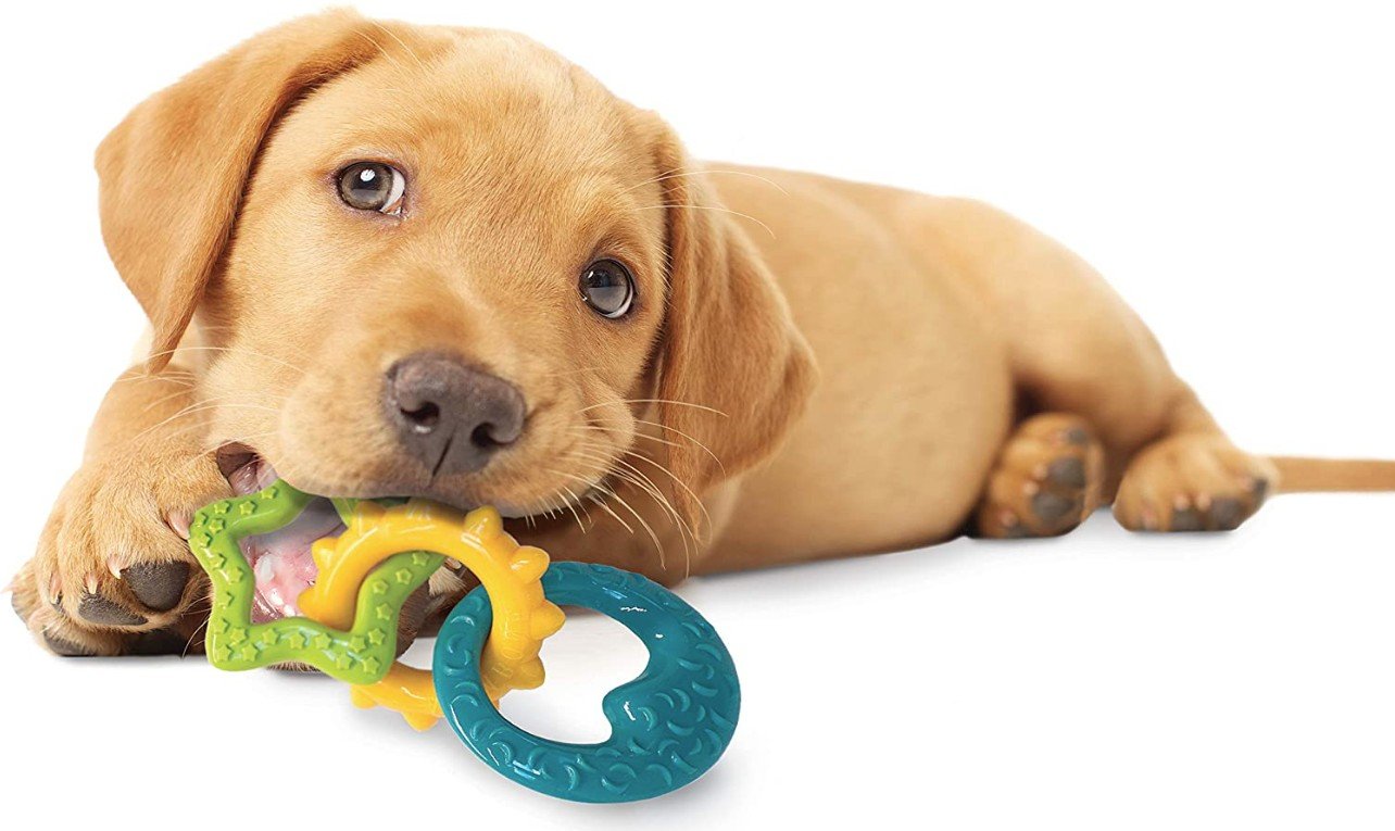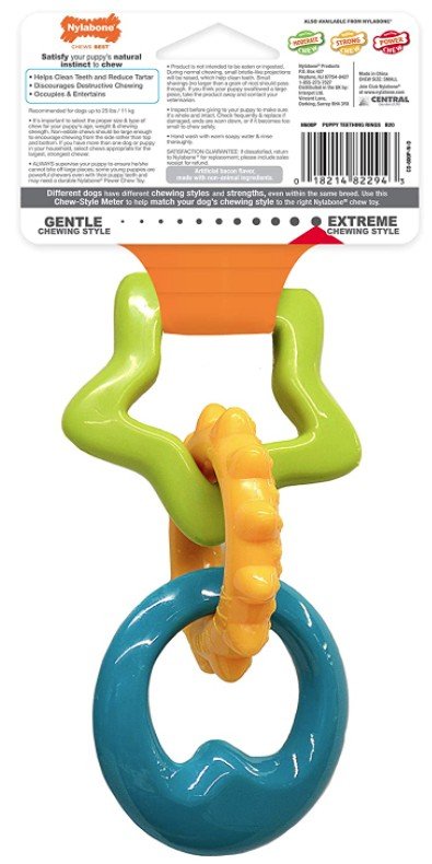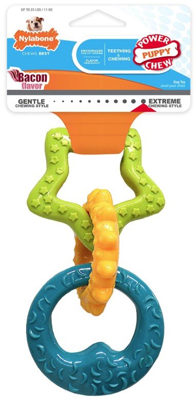 Nylabone Puppy Teething Rings are durable, interlocking rings that satisfy the chewing urges of young and teething dogs. Dental nubs help clean teeth and reduce tartar while a savory bacon flavor throughout keeps energetic puppies entertained and occupied.