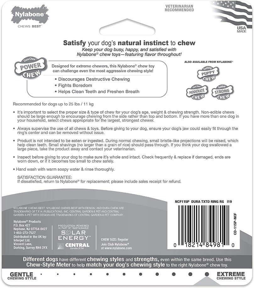 Powerful dogs need powerful chew toys! This durable textured dog ring comes from our extensive line of long-lasting Power Chew toys and is specifically made for aggressive chewers. Made from sturdy nylon, this tough dog chew toy stands up to your dog and features a textured surface that helps clean teeth as dogs chew. Your furry friend will also love its enticing flavor (color may vary), allowing for extended chew time sessions. Plus, this dog ring toy discourages destructive chewing and curbs issues like boredom and separation anxiety. Ready to satisfy your dog's natural urge to chew? Go ahead and give them a Nylabone chew toy!