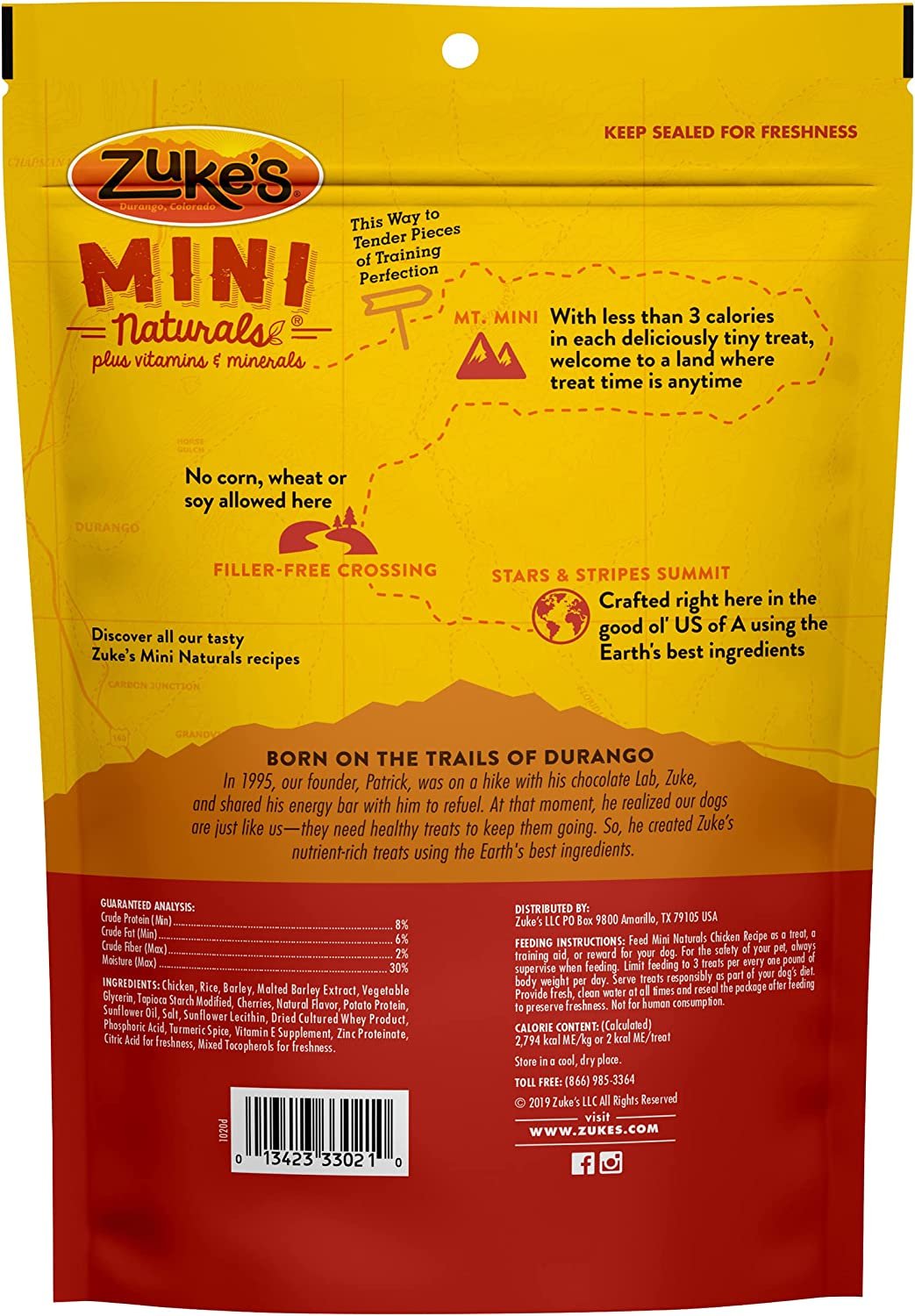 Zukes Mini Naturals are the bite-sized, low-calorie, healthy morsels your dog craves! These tasty, high protein natural treats are great for frequent rewards and perfect for training. Best of all, they're fortified with vitamins and minerals and made with real chicken for your dogs delight.
