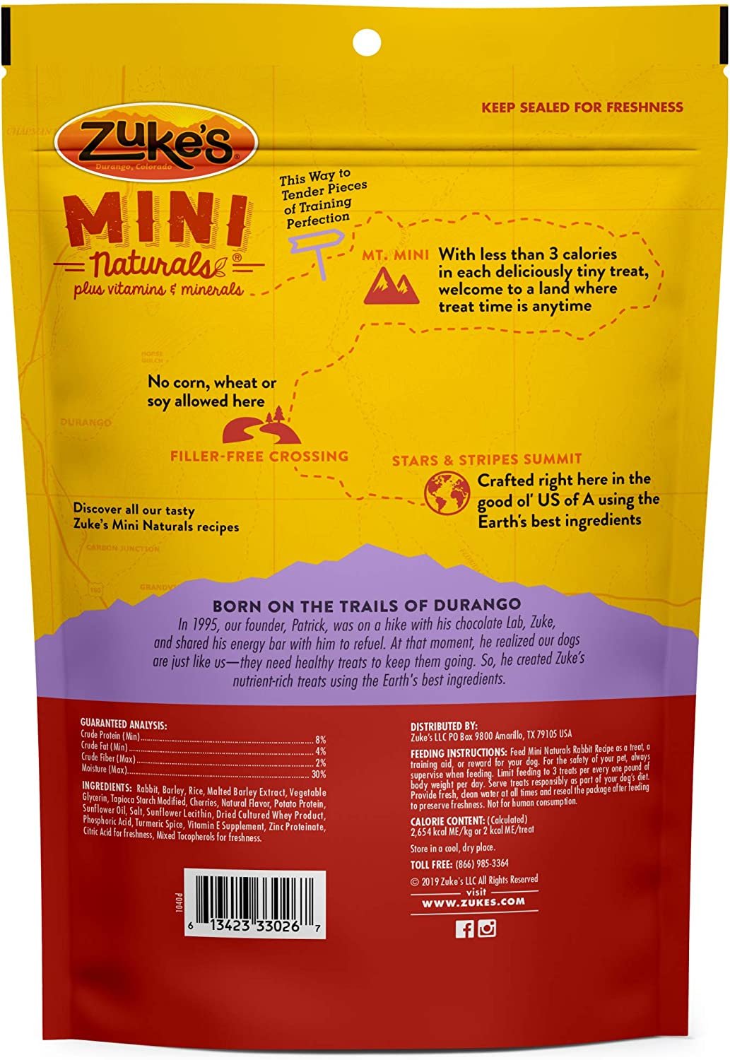 Zukes Mini Naturals are the bite-sized, low-calorie, healthy morsels your dog craves! These tasty, high protein natural treats are great for frequent rewards and perfect for training. Best of all, they're fortified with vitamins and minerals and made with real rabbit for your dogs delight.