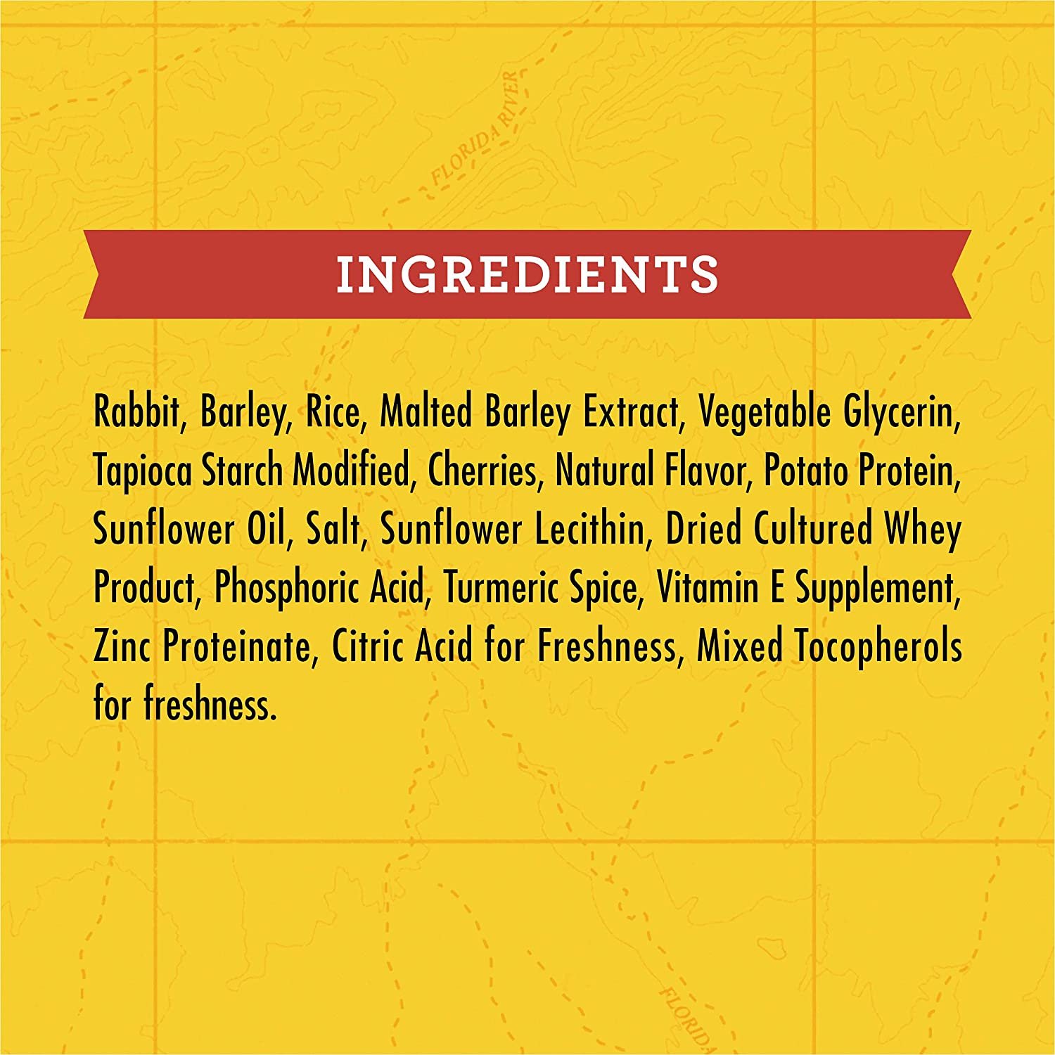 Ingredients: Rabbit, Ground Rice, Ground Barley, Malted Barley, Gelatin, Vegetable Glycerine, Tapioca, Natural Flavor, Cherries, Sunflower Oil, Lecithin, Salt, Phosphoric Acid, Sorbic Acid, Ascorbic Acid, Mixed Tocopherols.