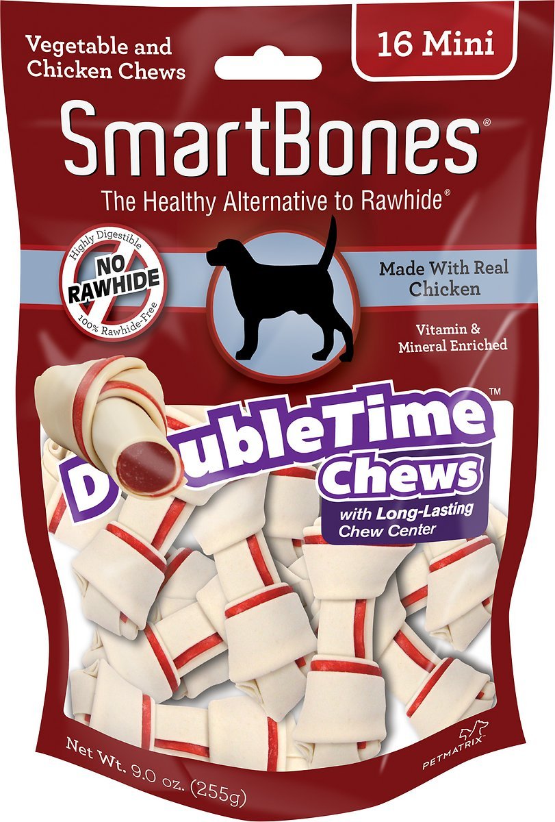 SmartBones Mini DoubleTime Bone Chicken Chews for Dogs are the healthy, rawhide-free chewing option your dog has been craving! Made with real chicken and nutritious vegetables, these tasty treats are easy to digest and super satisfying. A chewy chicken surprise waits in the center to reward your dog for doing what he does best!