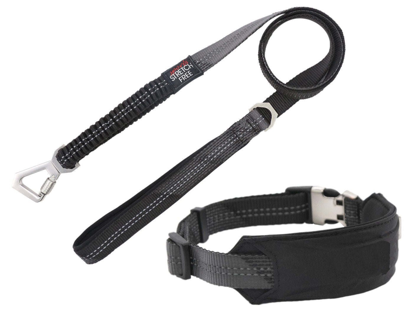 Pet Life ® 'Geo-prene' 2-in-1 Shock Absorbing Neoprene Padded Reflective Dog Leash and Collar is composed of Geometrically patterned Nylon webbing with Dual-Reinforced stitching and Neoprene padding by the collar and Leash handle for complete Durability and Comfort. The end portion of the Leash features a buffered and expandable looped elastic band that's designed to further place less tension around the neck while tugging or pulling for added comfort. Features reflective embedded stitching around the matching Dog collar and leash for complete night safety and visibility. Engineered and equipped with Metal Alloy engraved Quick-Connecting buckles on the collar and a unique and sporty swivel leash connector with a screw top mechanism that completely secures the leash and collar and provides a Multi-Directional pulling or tugging experience. Available in Multiple Sizes and Colors.