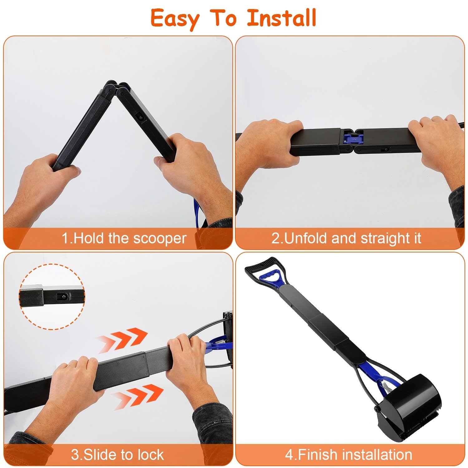 *Easy Operation*:Simply unfold and slide to lock the pooper scooper; quickly and easily. Then just pull the handle to pick up the waste of your lovely pet with only one hand needed. Perfect for dog walks; cleaning up your backyard; or when traveling!