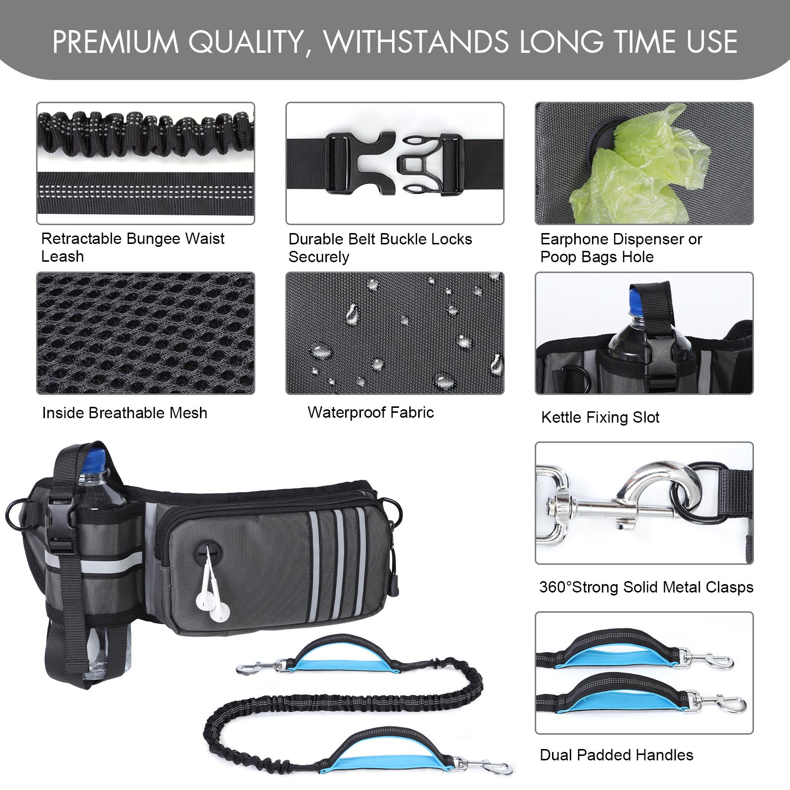 2.Premium Material Zipper Pouch made of Polyester Cloth, Waterproof, Durability and Hard to be Scratched, The Back made of Breathable, Skin-Friendly Mesh. Nylon Retractable Bungee Waist Leash and Durable Belt Buckle Locks Securely, Absorbs Pull Force from Dogs up to 150lbs.