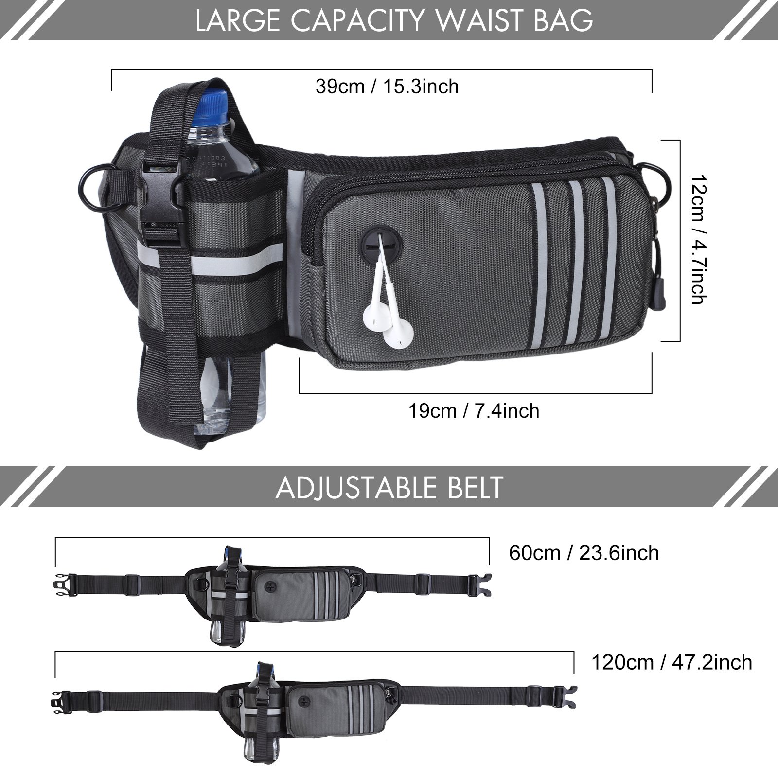 1.Multifunctional Zipper Pouch Large Capacity Bag with Water Bottle Pocket, Easy to Store your Smartphone, Earphone, Keys, Poop Bags, Dog Treats and Kettle. Adjustable Waistline Size from 23.6” to 47.2”, Choose the Most Comfortable Size of Waist Belt.