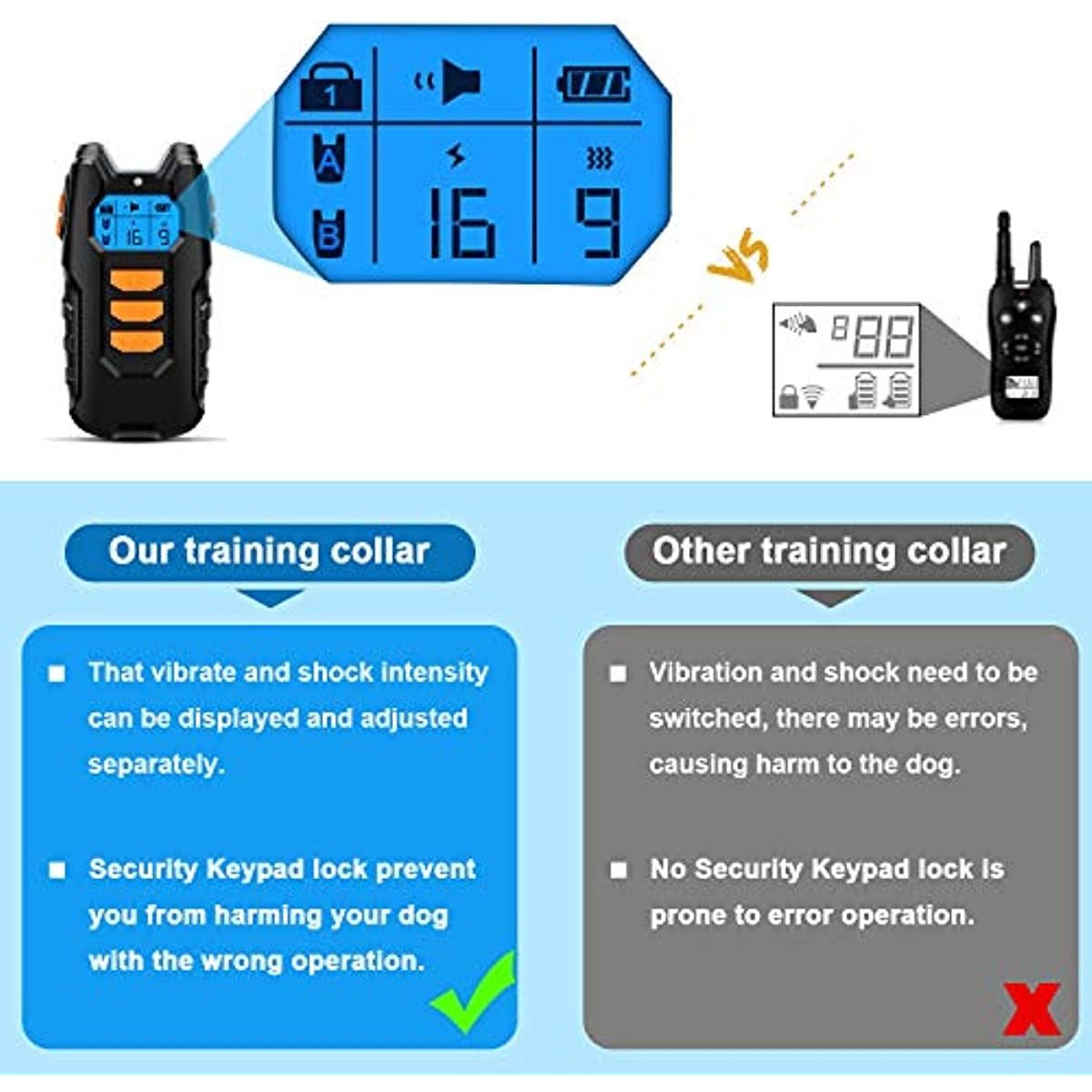 Dog shock collar with remote:The remote rang of the dog training collar up to 1000ft that allows you to train your pet easily both indoors and outdoors. So you can use it in a park; your backyard; at the beach; or anywhere else. 3 Modes; Training Dog Effectively :This dog shock collar has 3 modes-Standard Tone; Vibration(1-8)levels and Shock(1-16)levels.These modes are design to correct the dog's behavior such as aggression; peeing in the wrong place; sitting at the wrong time; unnecessary barking; and other inappropriate behaviors. Waterproof Dog Shock Collar & LCD display with backlight screen:The training collar receiver is waterproof IPX67 which give your pet more freedom during the outdoor activities. And the remote transmitter has LCD display with backlight which supports you to train your dog all the time. Multi-Dog training System &memory for settings: Our dog training collar have A+B channel design; This can train two dogs at the same time.Whether you have one or two dogs; you can easily accomplish the task of training it or them with 1 remote transmitter. And memory for settings makes it easy to operate; this means you can use this collar to train up to three different dogs with three different settings without resetting it. Security Keypad lock&Certification:The security keypad lock is the features of dog shock collar. It protects your dog from unintentional manipulation. In addition; the product passed the UL/CE/RoHS/FCC/UC38. 3/MDSD certification test. So; you can trust it.