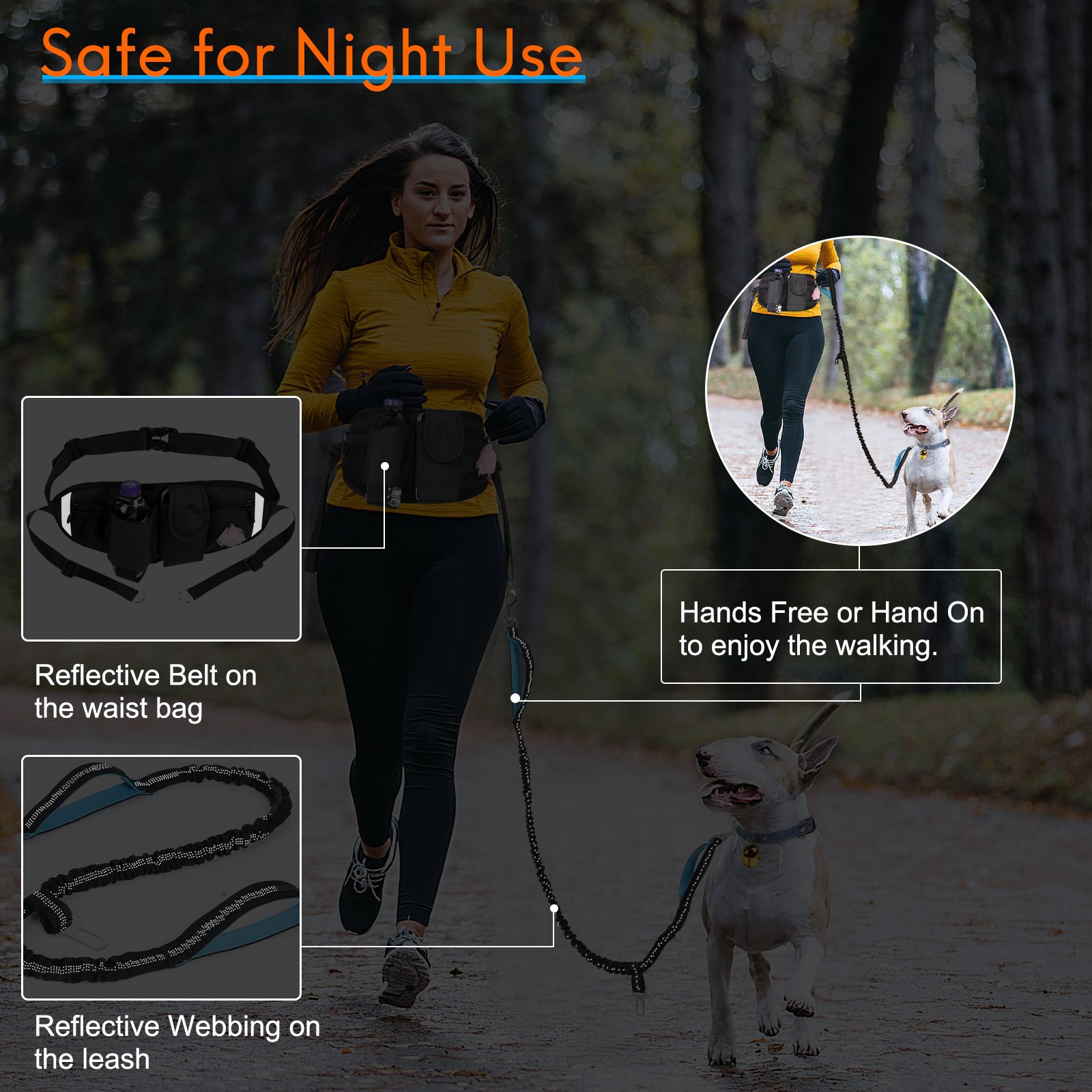 3.Be Safe and Reflective at Night,Reflective belt on the waist bag and reflective webbing on the leash, be safety and visible for both you and pets, enjoy walking with your dogs at night or running in the early morning.