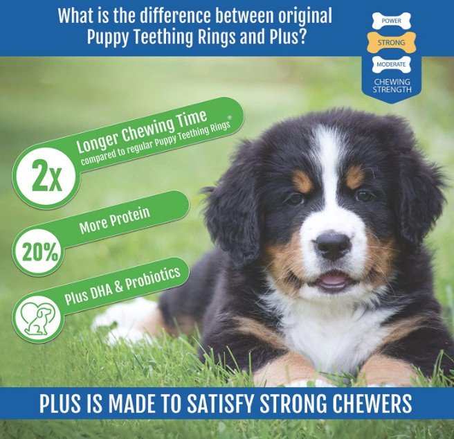 Puppy Teething Rings Plus is formulated for a longer-lasting chew experience to satisfy strong chewers and is powered by GanedenBC30, a natural probiotic that may support immune and digestive health. Plus more protein, calcium, and DHA for healthy teeth, bones, and brain development.