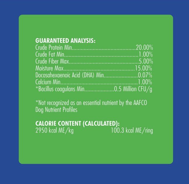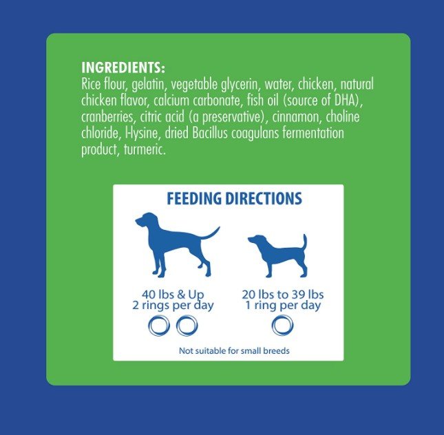 Ingredients: Rice flour, gelatin, vegetable glycerin, water, chicken, natural chicken flavor, calcium carbonate, fish oil (source of DHA), cranberries, citric acid (a preservative), cinnamon, choline chloride, l-lysine, dried Bacillus coagulans fermentation product, turmeric.