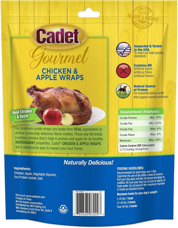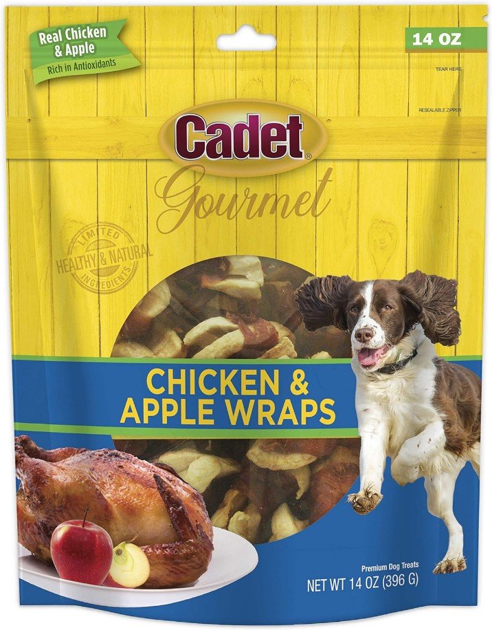 Cadet knows that good dogs deserve even better treats. Reward your best friend with premium dog treats made from the highest-quality ingredients you both can feel good about! Cadet Chicken & Apple Wraps are wrapped dog treats made with real ingredients. Each low-fat dog treat features antioxidant-rich apple wrapped with high-protein chicken for an irresistible flavor combination. Crafted with your dog's well-being in mind, these wholesome chicken and apple dog treats are naturally delicious and do not contain any artificial colors, fillers, or flavors.