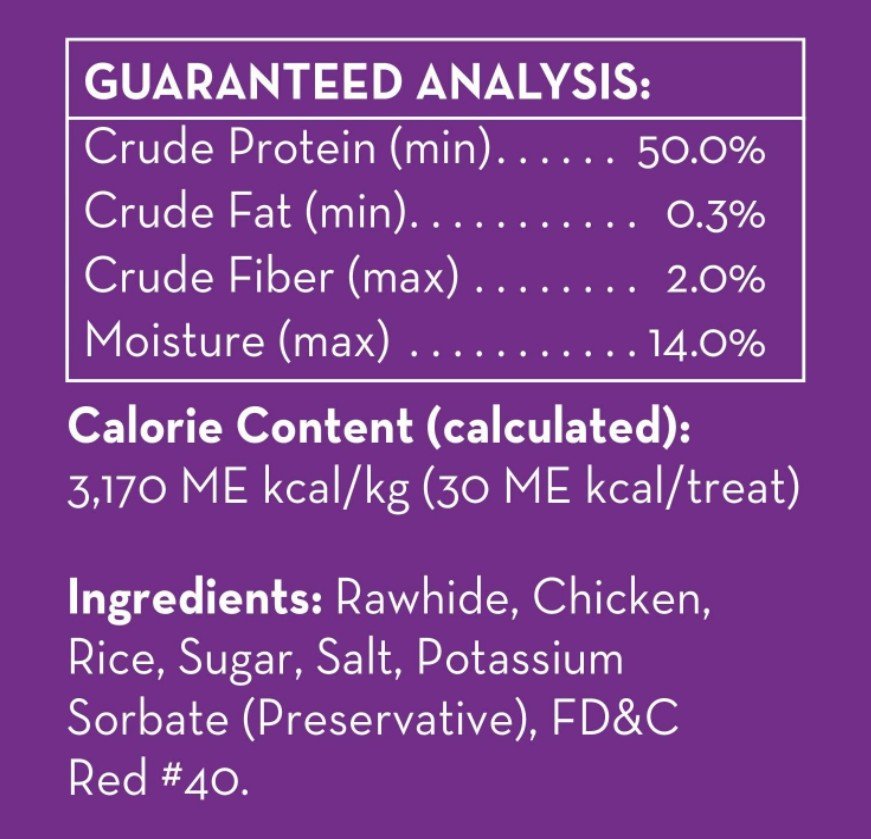 Ingredients: Rawhide, Chicken, Pork, Water, Corn Sugar, Salt, Potassium Sorbate (preservative), FD and C Red 40.