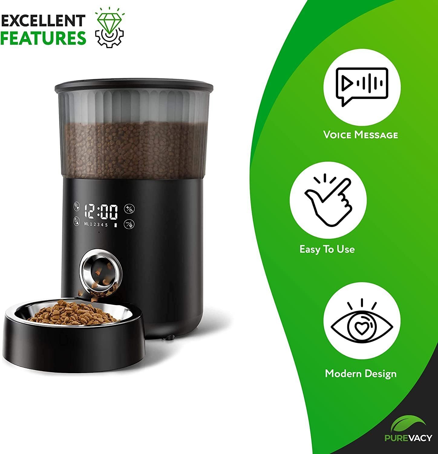 PUREVACY Automatic Cat Feeder with Programmable Timer Feed. 4L Food Dispenser with Portion Control & Voice Recorder. Smart Auto Dog Feeder with Stainless Steel Bowl and Desiccant Bag for Dry Food